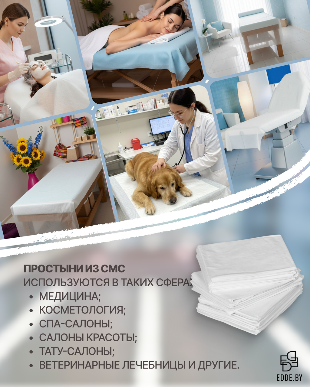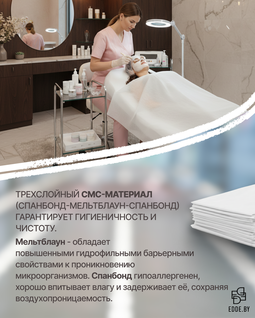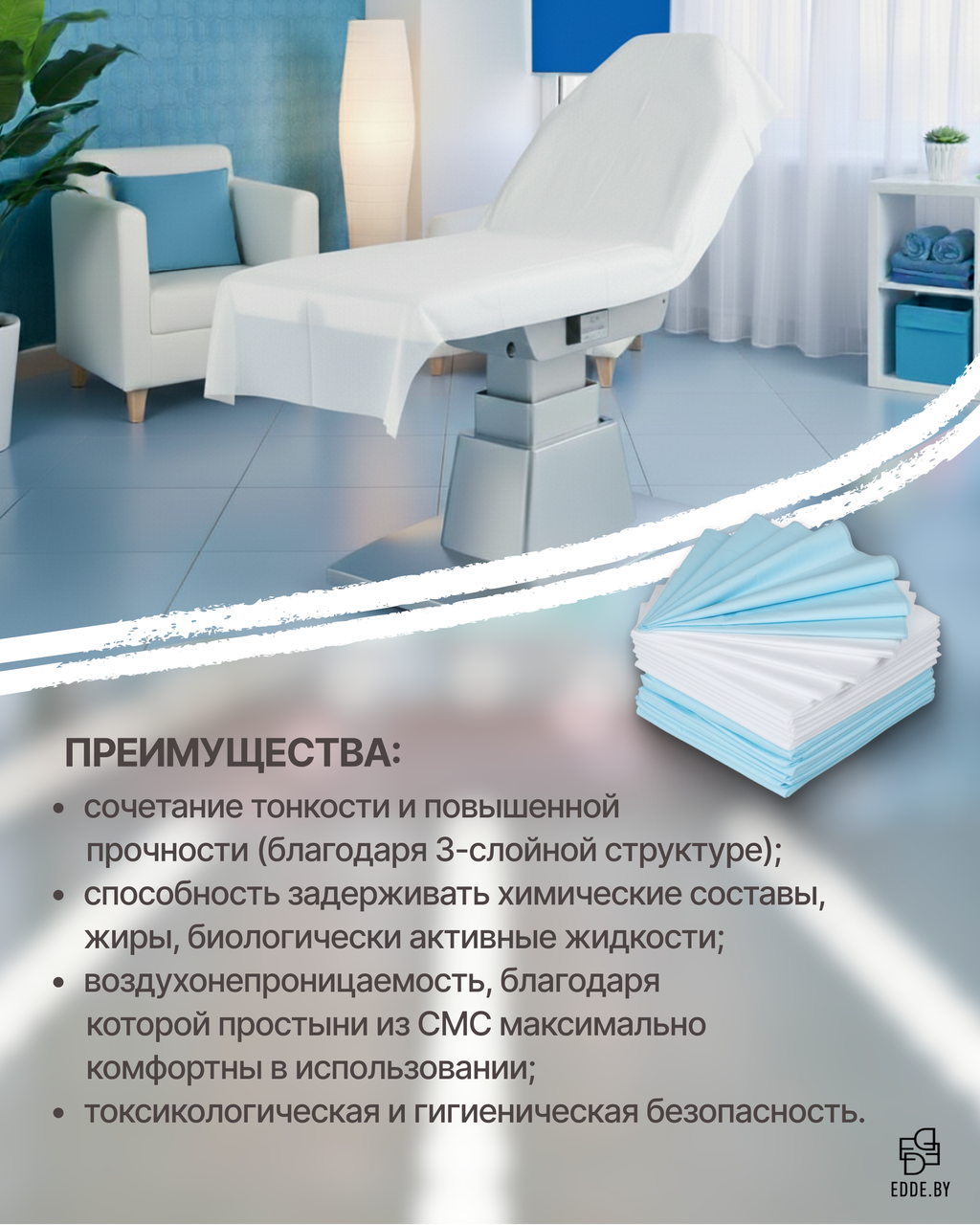 Одноразовые простыни в сложении из СМС – это удобное и гигиеничное решение для медицинских учреждений, косметологических кабинетов и салонов красоты, обеспечивающее комфорт и защиту во время процедур.